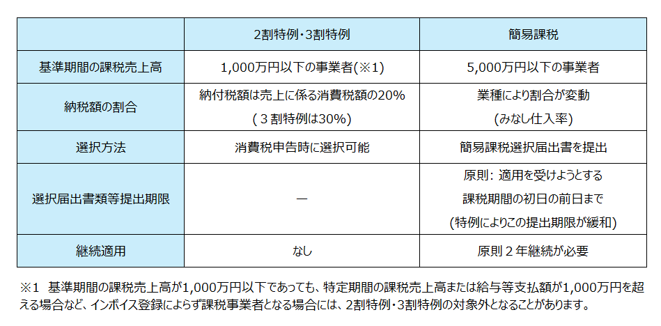 インボイス制度の経過措置である2割特例・3割特例と簡易課税がどのような事業者に適用されるのか、どのような特徴があるのか整理します。
